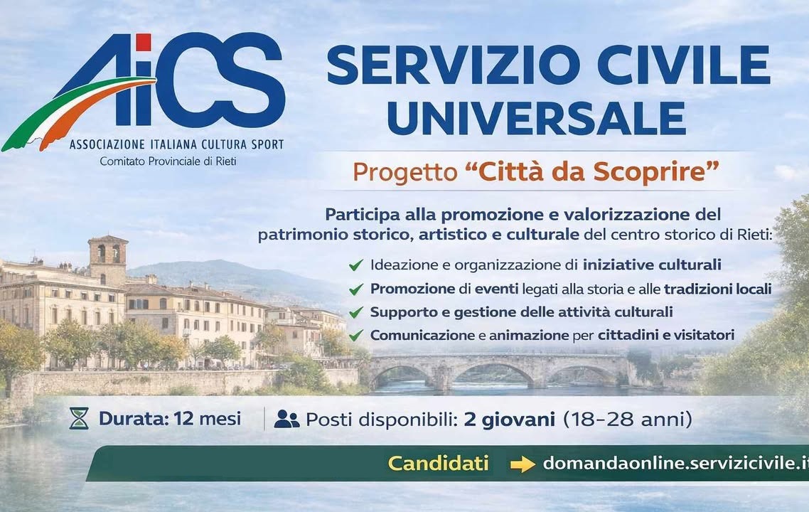 È aperto il bando per il Servizio Civile Universale con il progetto “Città da Scoprire”, promosso da AICS – Associazione Italiana Cultura Sport. Un’opportunità concreta per i giovani che vogliono impegnarsi nella valorizzazione del patrimonio culturale e artistico del territorio. Durata: 12 mesi, 25 ore settimanali, posti disponibili a Rieti: 2. I volontari saranno coinvolti nella promozione e valorizzazione del patrimonio storico, artistico e culturale della città di Rieti. In particolare: ideazione e organizzazione di iniziative culturali, promozione di eventi legati alla storia e alle tradizioni locali, supporto anche digitale nella gestione e programmazione di attività culturali, comunicazione e diffusione delle informazioni (in presenza e online), attività di animazione culturale per cittadini e visitatori.