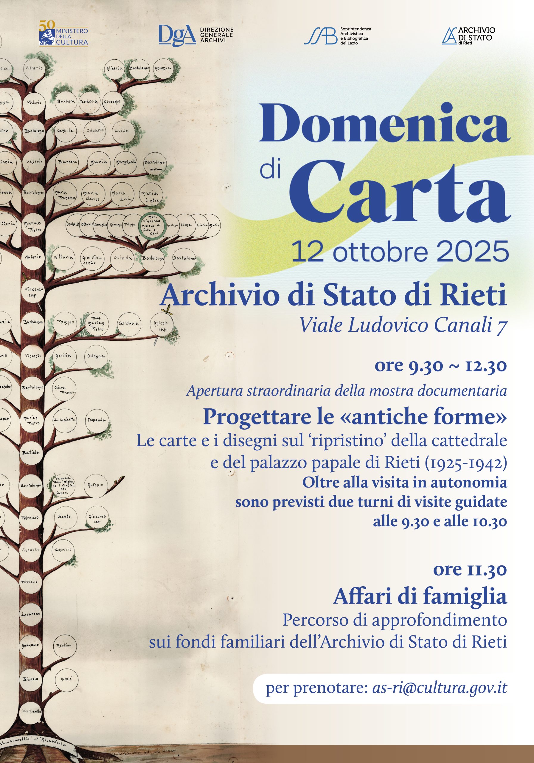 Sarà inoltre possibile, dalle ore 9:30 alle 12:30, visitare la mostra documentaria “Progettare le antiche forme”. Le carte e i disegni sul ‘ripristino’ della cattedrale e del palazzo papale di Rieti (1925-1942), il percorso espositivo inaugurato il 27 settembre per le Giornate europee del patrimonio – GEP e nella cornice del Giubileo della cattedrale di Santa Maria a Rieti. Oltre alla fruizione in autonomia saranno previsti due turni di visite guidate: uno alle 9.30 e uno alle 10.30. Per partecipare alle visite guidate e/o ad Affari di famiglia è necessario prenotare all’indirizzo di posta elettronica as-ri@cultura.gov.it, specificando a quale iniziativa si intende prendere parte.