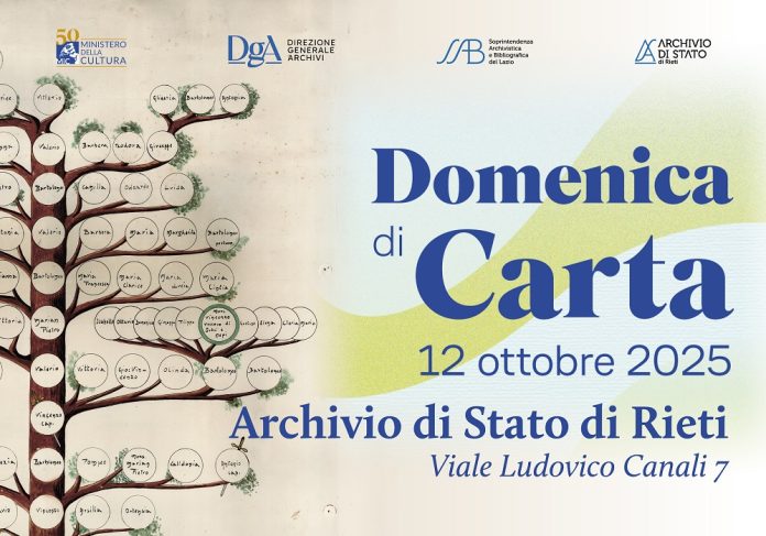 Il 12 ottobre nuova apertura straordinaria per l’Archivio di Stato di Rieti in occasione della Domenica di carta, l’appuntamento annuale che vede protagonisti gli istituti archivistici e bibliotecari del MiC, impegnati a valorizzare il loro patrimonio attraverso eventi culturali, esposizioni e attività di carattere divulgativo. Questo il programma del nostro Istituto per l’edizione 2025. Il tema indicato quest’anno dalla Direzione generale Archivi è “Gli archivi di famiglia”. In aderenza all’argomento comune, l’Archivio di Stato di Rieti proporrà, alle ore 11:30, Affari di famiglia. Percorso di approfondimento sui fondi familiari dell’Archivio di Stato di Rieti. Il personale scientifico dell’Istituto guiderà i partecipanti alla scoperta delle specificità degli archivi di famiglia a partire dai numerosi esempi offerti dal patrimonio documentario reatino, soffermandosi su particolari casi di studio e illustrando le principali tipologie documentarie e i problemi archivistici e conservativi posti dal materiale.