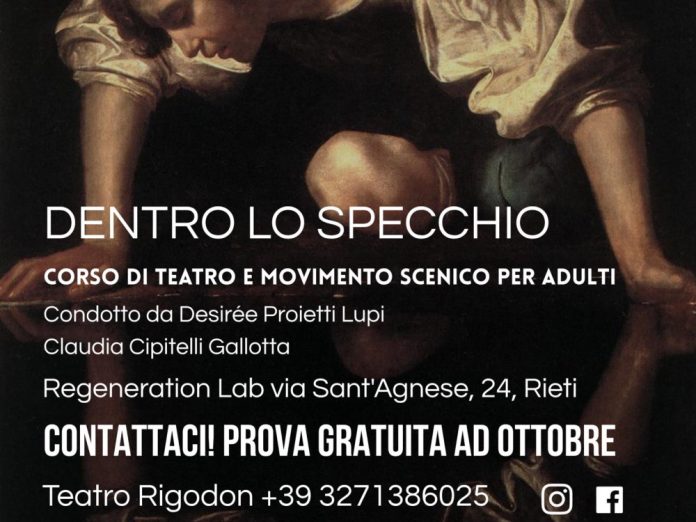 Da lunedì 6 ottobre, e ogni lunedì del mese, è attivo dalle ore 20:30 alle 22:30, presso il Regeneration Lab in via Sant’Agnese 24, Rieti il laboratorio di teatro e movimento scenico per adulti “Dentro lo specchio”. Il corso, che si terrà ogni lunedì sera, è un percorso di esplorazione attraverso il linguaggio del corpo, la presenza scenica e la consapevolezza di sé, condotto dall’attrice e pedagoga teatrale Desirée Proietti Lupi e dalla danzatrice Claudia Cipitelli Gallotta.