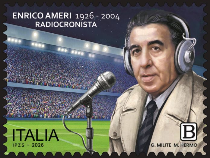 Completano il francobollo le legende “ENRICO AMERI”, “RADIOCRONISTA” e le date “1926 – 2004”, la scritta “ITALIA” e l’indicazione tariffaria “B”.