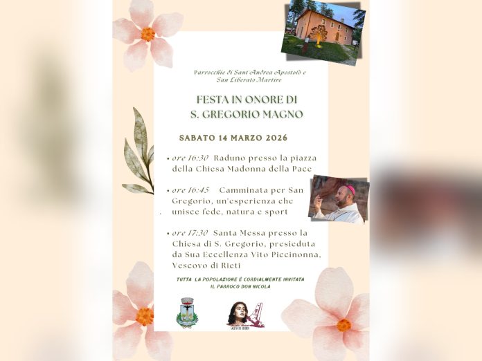 Sabato 14 marzo dalle ore 16:30 a Cantalice celebrazione in onore di San Gregorio Magno. Il raduno è previsto in piazza Chiesa Madonna della Pace. A seguire Camminata per San Gregorio, una esperienza che unirà fede, natura e sport. Alle ore 17:30 Santa Messa officiata dal Vescovo di Rieti, Sua Eccellenza monsignor Vito Piccinonna.
