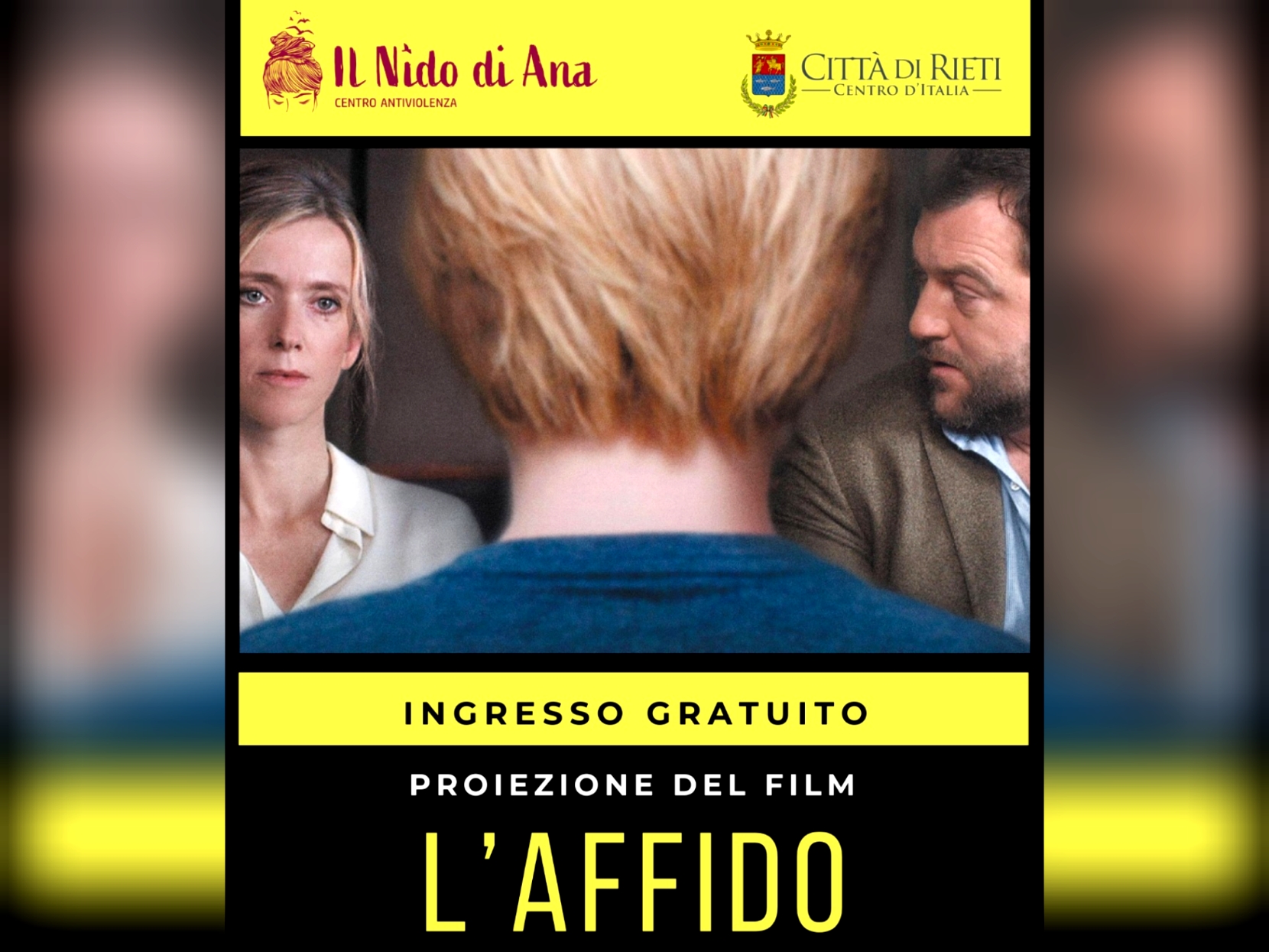 In occasione della Giornata Internazionale per l’eliminazione della violenza contro le donne, il giorno 28 novembre 2025 alle ore 17:30 si terrà presso il Cinema Moderno di Rieti la proiezione del film L’affido, di Xavier Legrand, premiato con il Leone d’Argento e il Leone del Futuro alla Mostra Internazionale d’Arte Cinematografica di Venezia nel 2018. Il film tratta lo spinoso problema dell’affido di minori in caso di separazione dei genitori in situazioni violenza di genere, in particolare la violenza assistita a cui sono esposti loro malgrado bambini e bambine. La proiezione del film sarà preceduta da una breve presentazione e sarà conclusa da un dibattito aperto sul tema della violenza di genere.