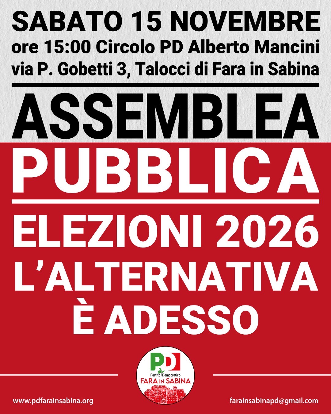 Il Partito Democratico invita tutti i cittadini a partecipare attivamente: la costruzione dell’alternativa passa dalla voce e dal contributo di ciascuno. Solo così sarà possibile offrire alla città una proposta credibile, innovativa e capace di rispondere alle sfide dei prossimi anni. Per informazioni: www.pdfarainsabina.org – farainsabinapd@gmail.com