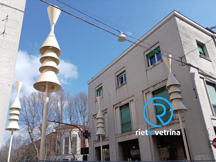 Sulla evocazione del senso di appartenenza, viste le reazioni dei cittadini, possiamo sin d’ora affermare che il Sindaco, che rivendica tale scelta, sia promotore di un tentativo fallito, proprio nei giorni in cui a Roma si chiude la mostra “il Tempo del Futurismo” alla Galleria Nazionale d’Arte Moderna e Contemporanea, promossa dal Ministero della Cultura. Volendo giocare con le delucidazioni rilanciate nella scelta delle “plafoniere”, la spiegazione offerta ci pare però più un rimando al vicino pub Depero, piuttosto che una annotazione storica. Incuriosisce infatti il fatto che gli “‘imbuti futuristi” debbano “dialogare” con palazzi edificati dopo il 1950, quando il futurismo italiano aveva ormai perso qualsiasi spinta propulsiva, mentre la corrente architettonica del “razionalismo” o del “funzionalismo”, in questo caso impropriamente messa a braccetto del “futurismo” seguiva la sua evoluzione sui binari delle architetture internazionali. Peraltro, i due palazzi all’ingresso di Porta Cintia non sono qualificabili di particolare pregio storico od architettonico, né risulta furono mai celebrati, sin dalla edificazione, per un presunto “carattere identitario”. Sul tema rimandiamo alla bella pubblicazione “Rieti Ieri e Oggi” nelle foto del compianto Luigi Berardinetti, che, anche dal punto di vista iconografico, racconta vicende e motivazioni con cui la città subì lo scempio della demolizione della porta preesistente, integrata nelle mura medioevali.
