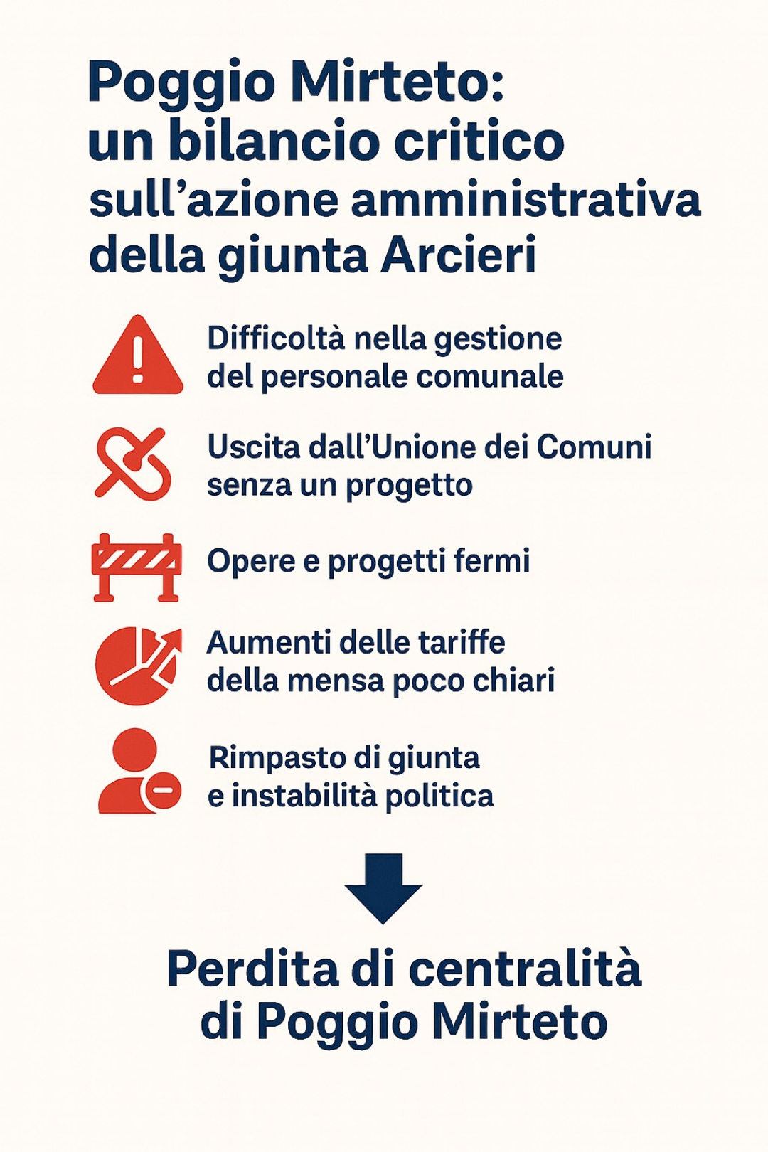 Prima tra tutte, la gestione del personale comunale, caratterizzata da questioni irrisolte che continuano a creare incertezza e difficoltà operative. Una situazione che impatta direttamente su uffici strategici per il funzionamento della macchina comunale, tra cui quello del Giudice di Pace, con ricadute negative sui servizi destinati ai cittadini. A ciò si aggiunge la decisione, a nostro avviso affrettata e priva di una visione strategica, di uscire dall’Unione dei Comuni della Bassa Sabina. Una scelta non accompagnata da un progetto alternativo capace di garantire cooperazione, sviluppo sostenibile e una crescita coordinata del territorio. Permangono inoltre evidenti difficoltà nel portare avanti opere e progetti già finanziati e avviati dalle precedenti amministrazioni. Una lentezza preoccupante, che rischia di far perdere opportunità preziose per Poggio Mirteto e di rallentare ulteriormente la capacità dell’ente di rispondere ai bisogni del territorio. Destano perplessità anche gli aumenti delle tariffe della mensa scolastica, giustificati con argomentazioni che molte famiglie hanno percepito come vaghe e poco trasparenti, in un ambito particolarmente delicato per la comunità.