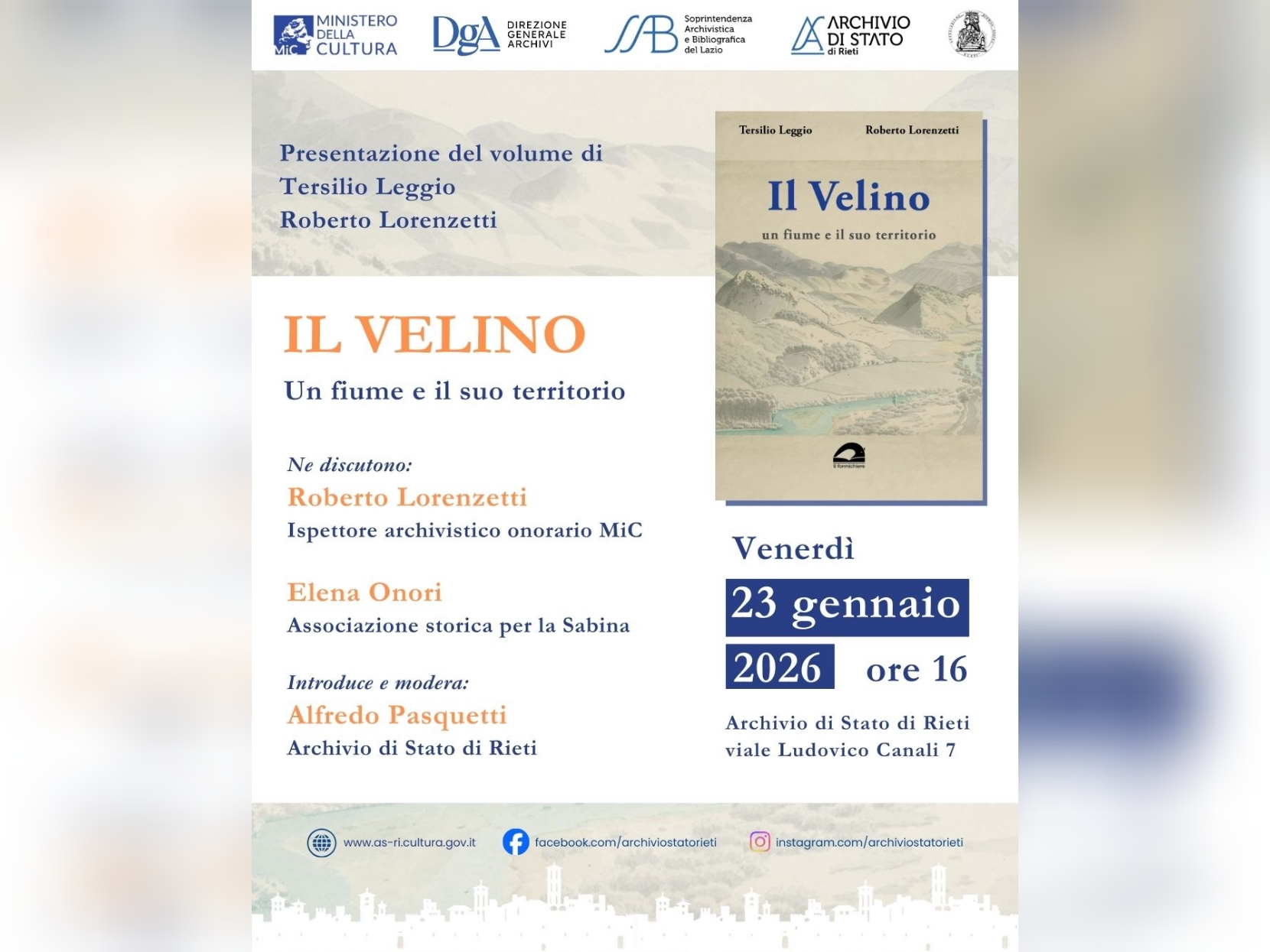 Venerdì 23 gennaio 2026, alle ore 16, presso la sala conferenze dell’Archivio di Stato di Rieti in viale Ludovico Canali 7, avrà luogo la presentazione del volume di Tersilio Leggio e Roberto Lorenzetti, Il Velino. Un fiume e il suo territorio (Foligno, Il Formichiere, 2025). La manifestazione è organizzata in collaborazione con l’Associazione storica per la Sabina. La pubblicazione propone la relazione storica inedita che i due autori curarono una quarantina d’anni fa nell’ambito del progetto, mai realizzato, del parco fluviale del Velino, a suo tempo affidato all’ingegnere Giuliano Cannata. Leggio si dedicò alla parte relativa all’antichità e al medioevo, Lorenzetti a quella sui periodi più recenti. Data l’urgenza, i ricercatori consegnarono il dattiloscritto senza neanche avere il tempo di fotocopiarlo, ma dopo la morte di Leggio (29 aprile 2024), sistemando il proprio archivio privato, Lorenzetti si è imbattuto in una busta contenente una prima stesura non corretta del lavoro, che, dopo opportuna revisione, è ora stato dato alle stampe.