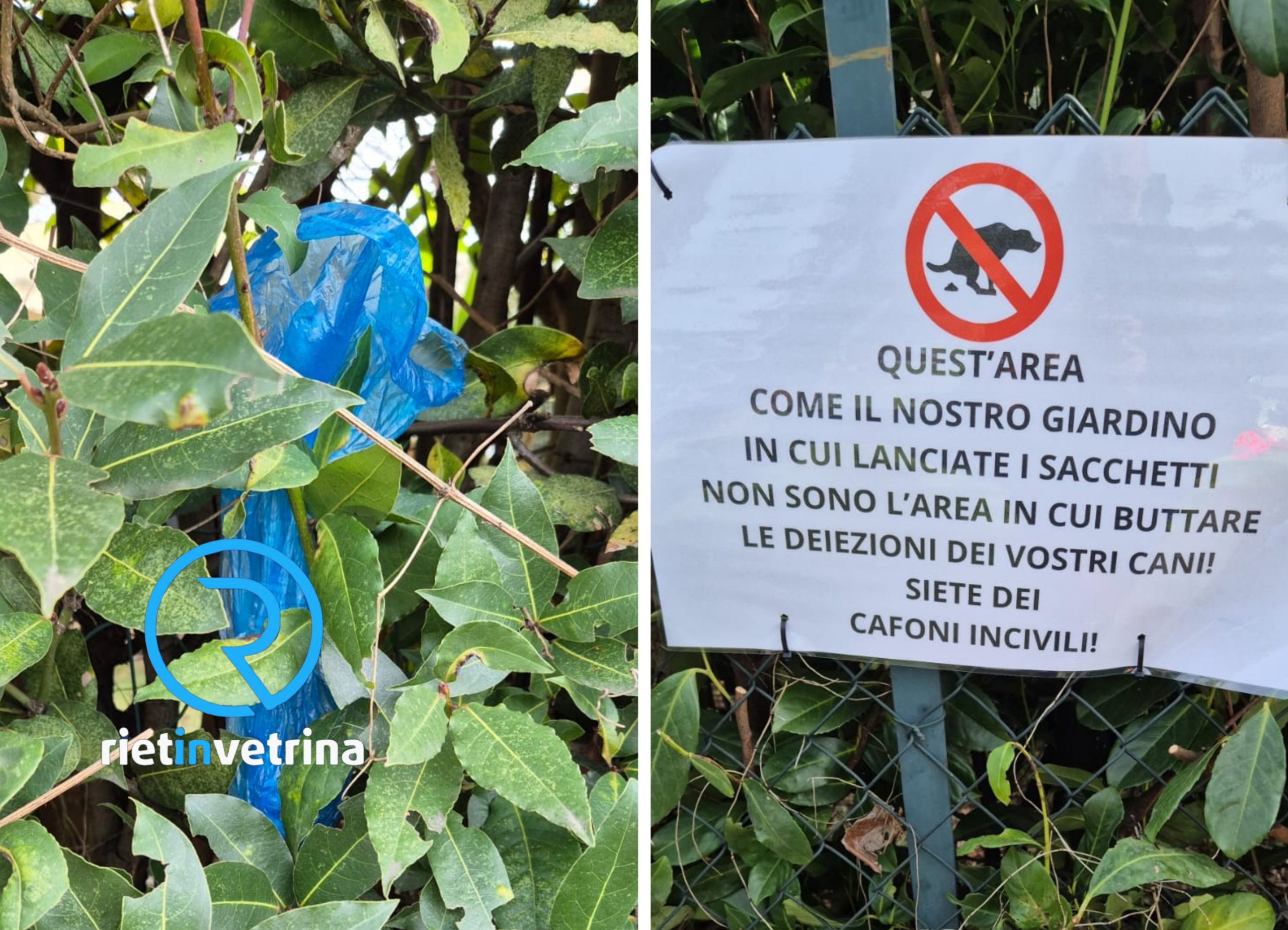 Un residente di via Cipriani a Campoloniano scrive a Rietinvetrina ed invia due foto per la nostra rubrica SEI TU IL REPORTER, segnalando una situazione che si protae ormai da tempo. Le persone raccolgono le deiezioni dei propri cani e poi le gettano nelle siepi private (a sx nella foto). Tutto questo nonostante i cestini per i rifiuti e nonostante il cartello affisso dagli abitanti della zona (a dx nella foto) riportante una precisa richiesta di senso civico. “Le cacche dei cani ci vengono lanciate nei giardini e nelle siepi, siamo stufi! Non siamo nè tutelati nè rispettati – commenta il lettore di Rietinvetrina – installeremo nelle nostre aree private delle telecamere per cogliere sul fatto chi non ha senso civico. Evidentemente questo è l’unico modo per dare un taglio a questa cattiva usanza” – conclude.