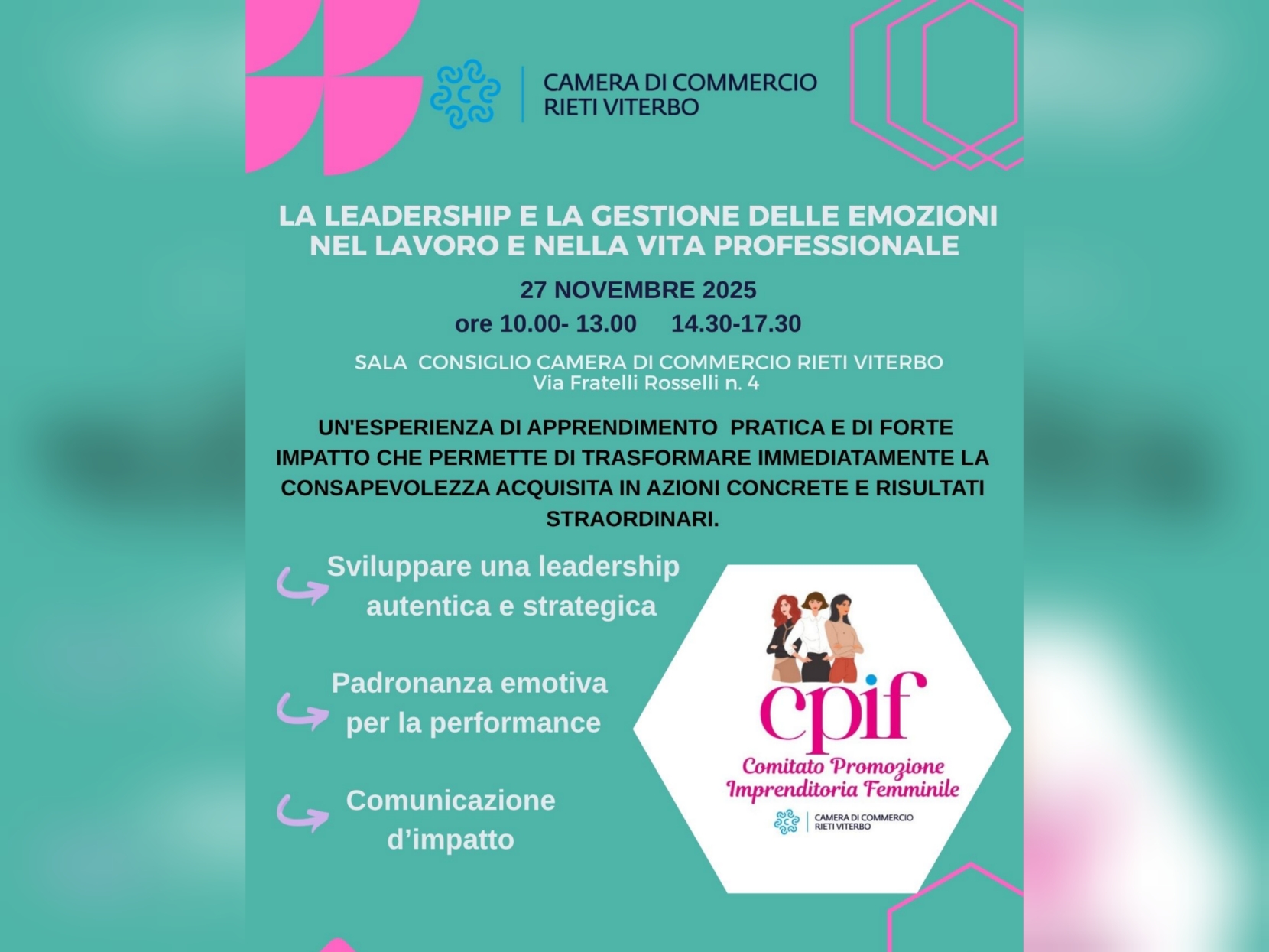 E’ dedicato a “La leadership e la gestione delle emozioni nel lavoro e nella vita professionale” l’evento formativo gratuito organizzato per giovedì 27 novembre dal Comitato di promozione dell’Imprenditoria femminile della Camera di Commercio di Rieti Viterbo. La giornata formativa si svolgerà presso la Sala Consiglio della Camera di Commercio Rieti Viterbo, in Via Fratelli Rosselli n. 4, con orario 10-13 e 14:30-17:30.